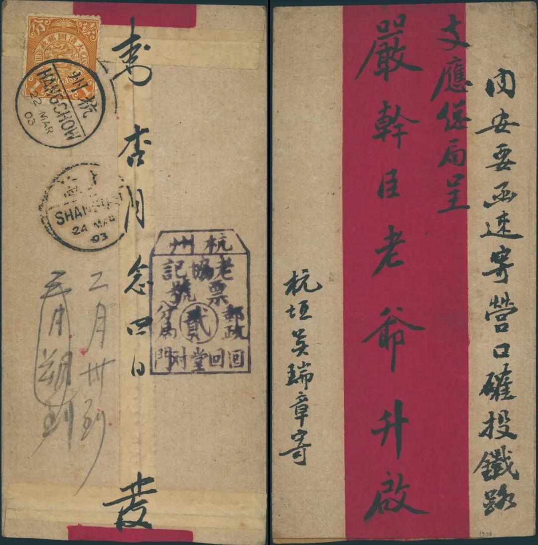 1903年杭州寄辽宁营口红条封1件,贴蟠龙1分票1枚,销3月22日杭州小圆戳,盖深蓝色“杭州/老协记票号/贰/邮政分局/回回堂对门”碑戳,另盖3月24日上海小圆到达戳,保存较好。该“回回堂”邮政分局戳记存世仅3件,十分珍罕,为天津集邮家李东园旧藏