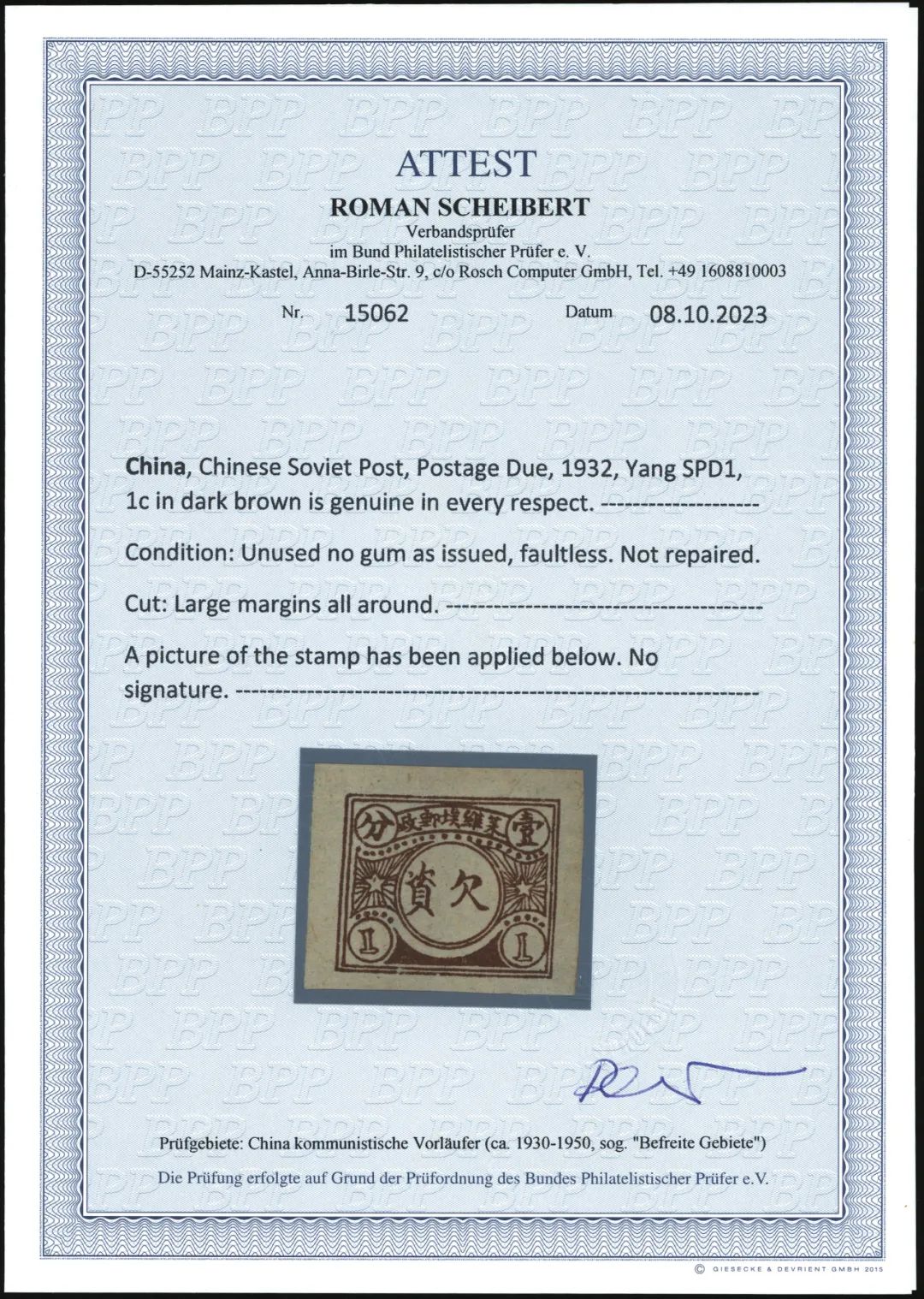 1932年苏维埃欠资1分票新票1枚,“䒩”字版,大宽边,原纸,无人为,上品,罕见,带2023年10月8日ROMAN SCHEIBERT鉴定证书