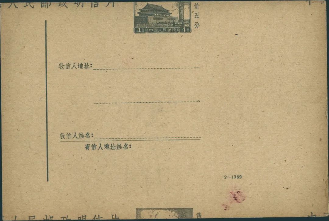 1959年普9天安门2-1959邮资片裁切大变体1件,未使用,带2个邮资图、4个片头,保存较好,为普9型天安门邮资片之罕见品