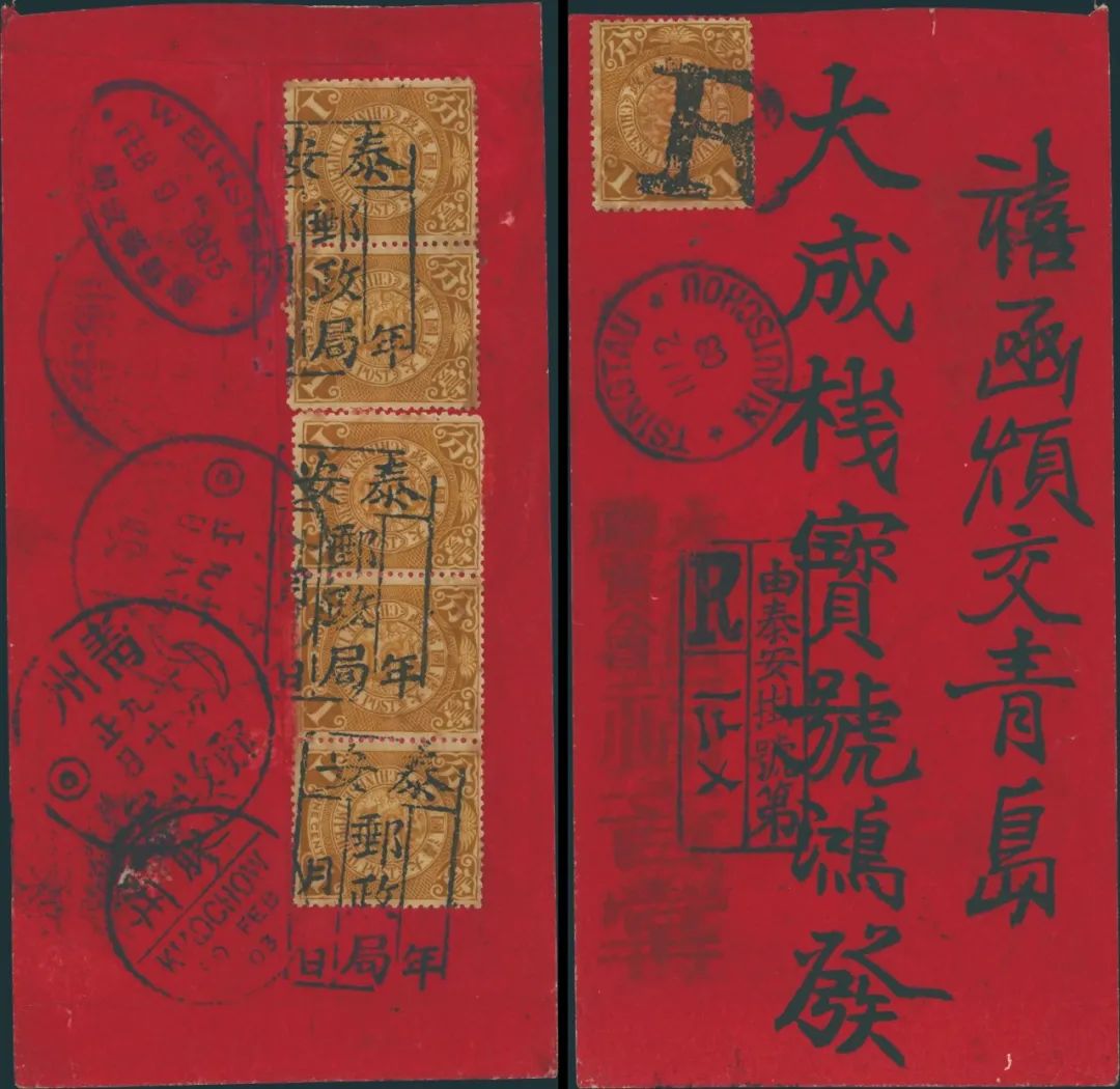 1903年泰安挂号寄青岛中式封1件,正反贴蟠龙1分票6枚,销泰安邮政局碑戳及“R”字挂号戳,旁盖“由泰安挂号第”挂号戳记,依次盖光绪廿九年正月初七日邹平邮政局日月戳、光绪廿九年正月初八日周村邮政局日月戳、光绪廿九年正月初十日青州邮政局日月戳、2月9日潍县邮政局椭圆戳、2月10日胶州小圆戳、2月11日青岛胶州德客邮到达戳,保存较好