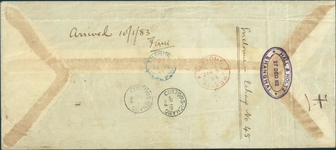 1882年上海福利公司寄宜昌海关马根封1件,封口盖紫色英文“HALL & HOLTZ”福利公司12月27日椭圆章,另盖蓝色12月27日上海工部书信馆戳(中间年月日字钉倒植)、红色1883年1月5日汉口海关戳、黑色1月10日宜昌海关到达戳,保存较好。该封为宜昌海关日戳极早期使用例,李镜禹旧藏