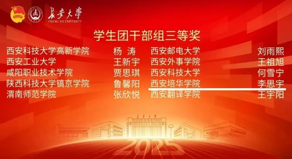 会计与金融学院团委书记刘经纬荣获教师团干部B组二等奖;智能科学与工程学院团委副书记李煜荣获教师团干部B组三等奖;文学院杨甜甜荣获学生团干部组二等奖;法学院李思宇荣获学生团干部组三等奖。