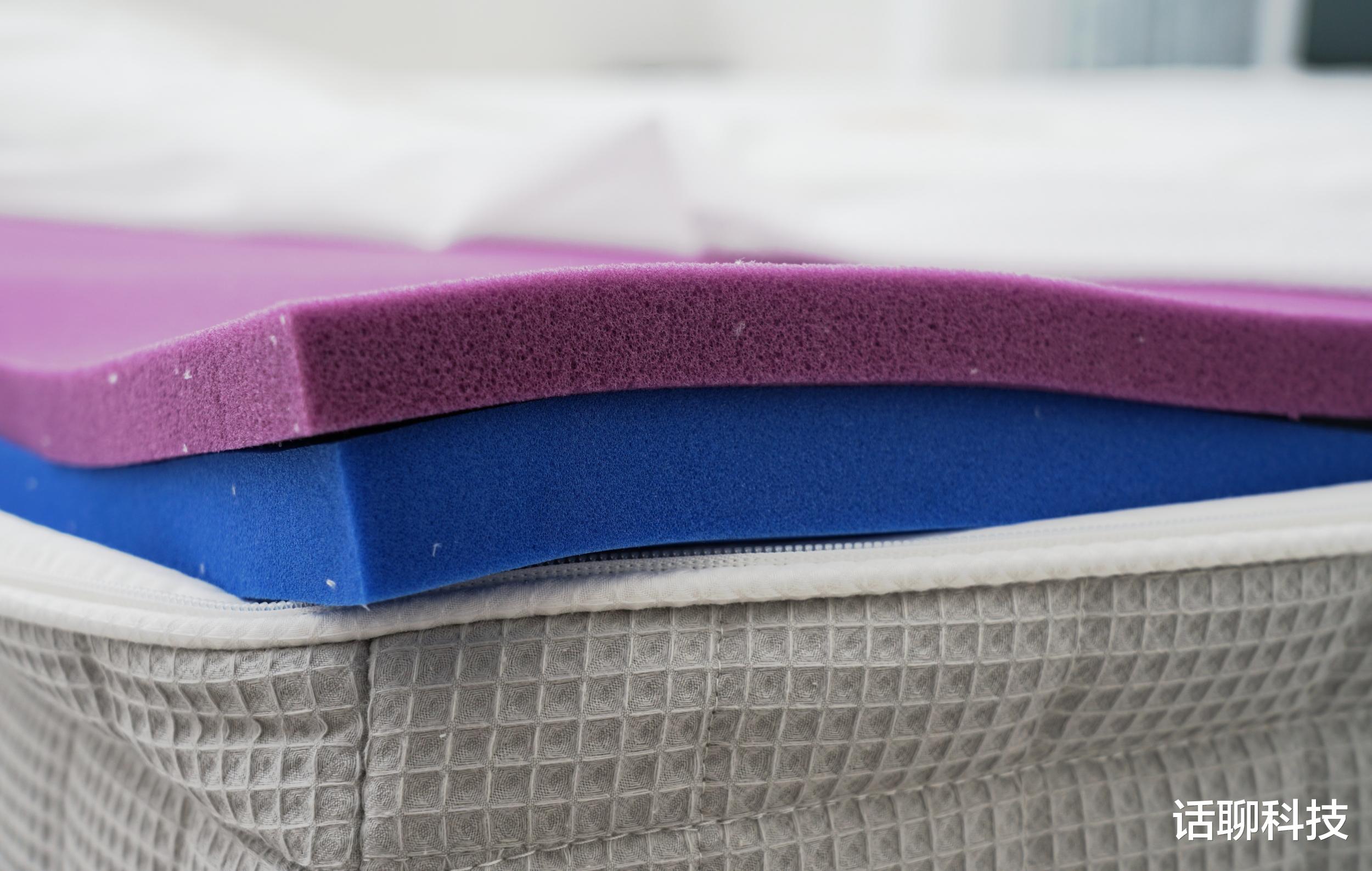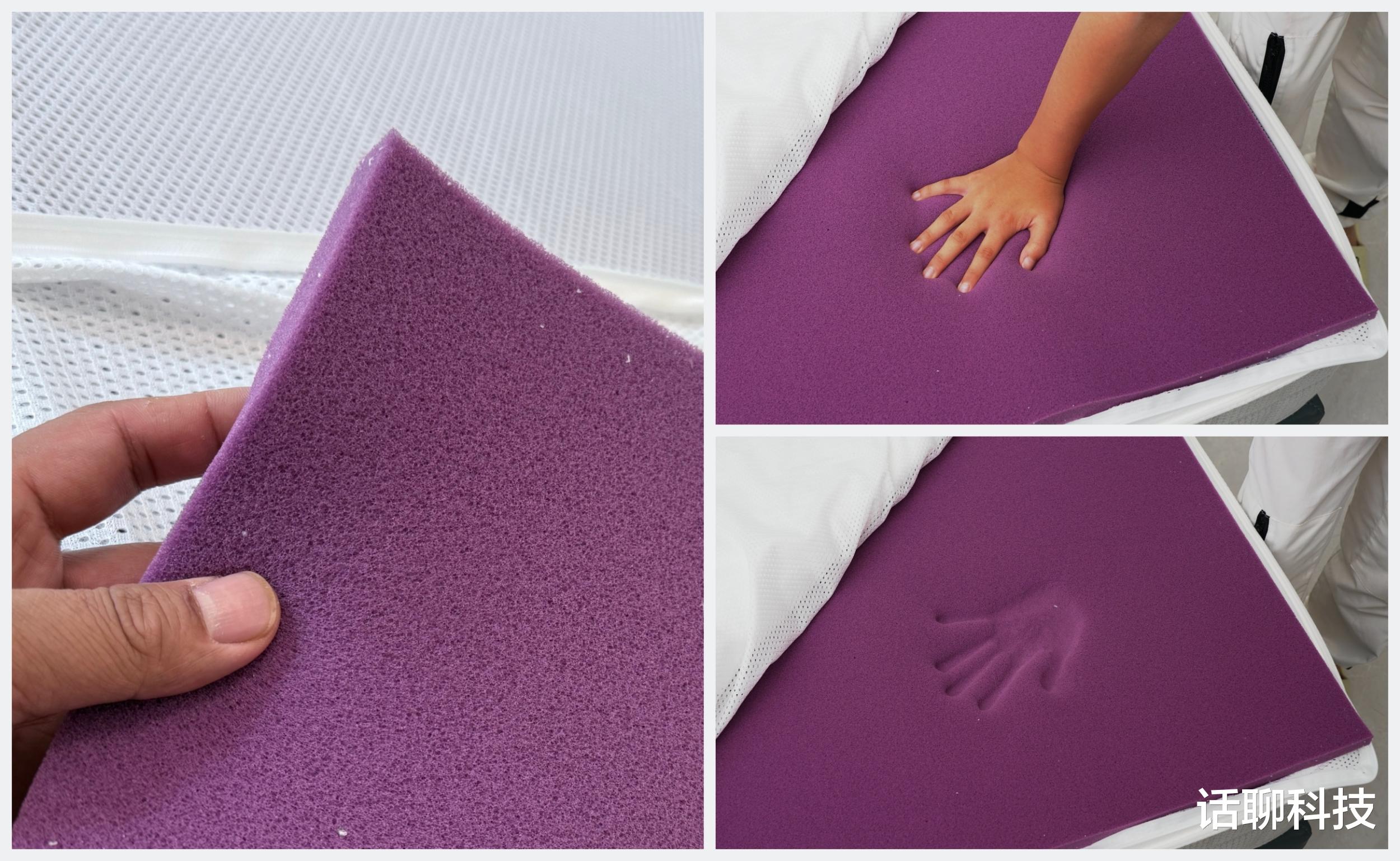 至于双层海绵垫内芯,紫色的是2cm厚度的记忆海绵层,蓝色的是2.5cm厚度的高密度支撑层。蓝色高密度支撑层,是当前很火热的生物基小蓝垫材料,环保性能突出,基料含有25%的豆蛋白成分;两层材料在生产过程中采用的都是MDI发泡工艺,安全性高了不少。