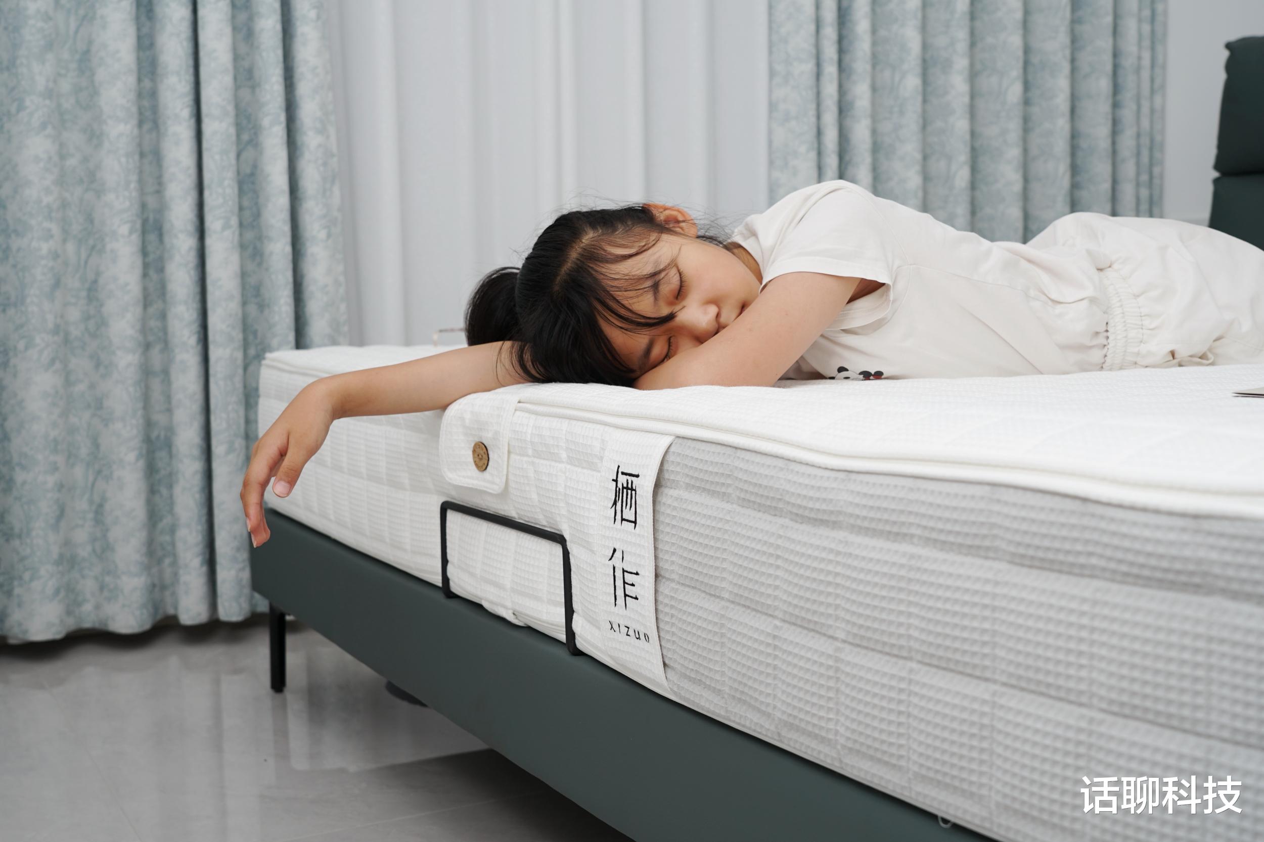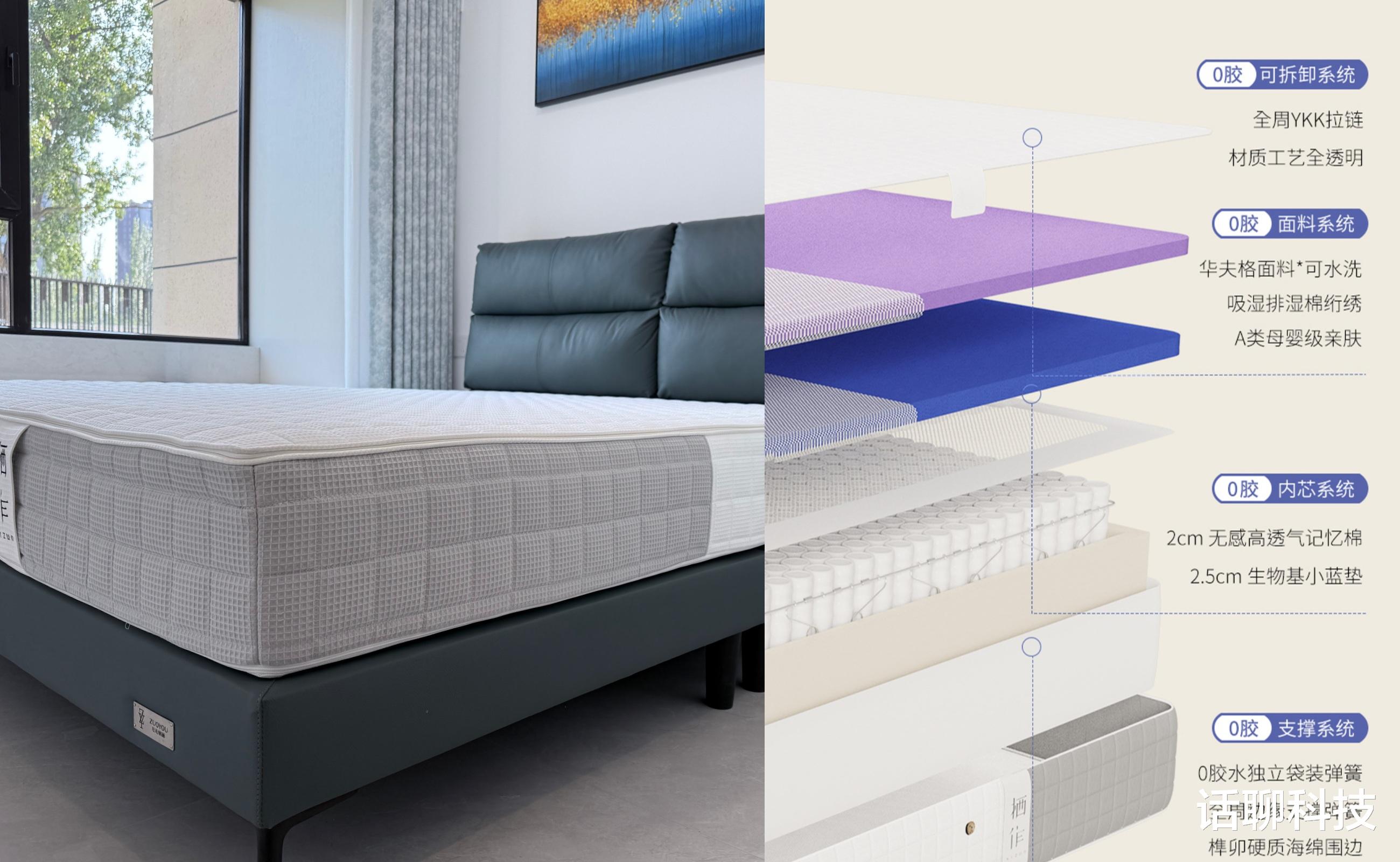 至于为什么选栖作坚果床垫?主要看中了其0胶水、可拆卸的设计特点。首先来说0胶水,这是因为整个床垫没有采用传统的胶粘方案,而是像千层饼一样采用独立层叠加的方案,具体可分为七层结构。