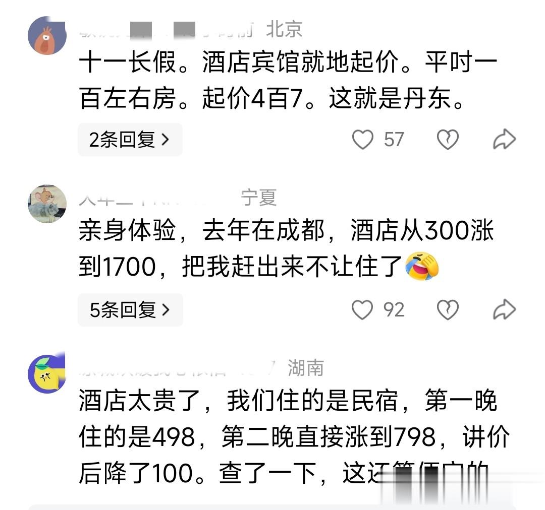 例如有的网友就吐槽了他的亲身经验,去年在成都酒店从之前的300元涨到了1700元。
