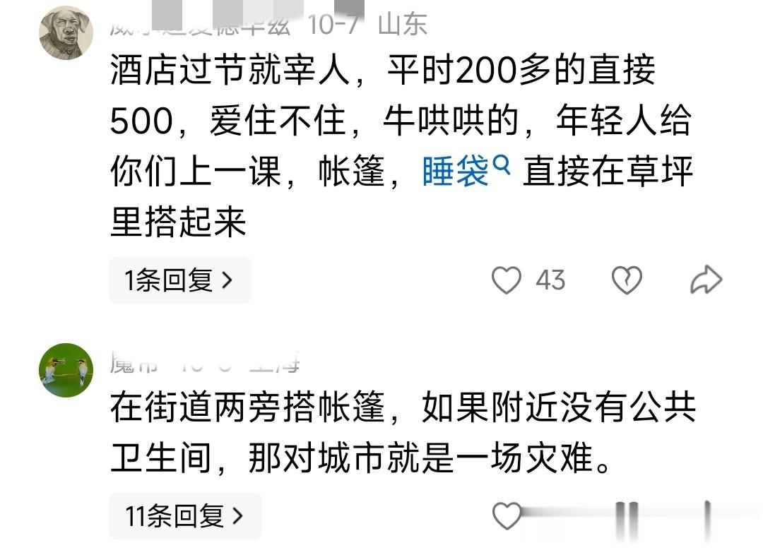 说住酒店就是宰人,住民宿也是宰人。所以很多的人都选择了带着帐篷或者带着睡袋,直接在路上或者草坪上搭起了帐篷来。对于附近没有公共卫生间的,这简直也是一场灾难,没得上厕所,而且还没得洗澡。还有就是安全的问题。