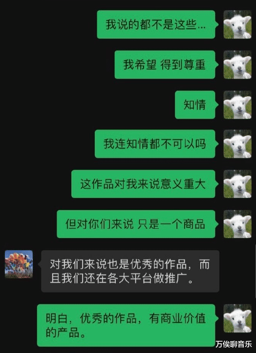 而这种对话似乎在嘲笑着广大原创作者:“从我决定推广你的作品那刻开始,你的作品就不属于你了,所以它再火,也是我推广的功劳,与你何干?”我想这也是造成很多时候歌火人不火的很大一个原因吧,这未免让创作者太寒心,似乎这一点他们也不在乎,只在乎歌曲的商业价值,也就是怎么捞钱。