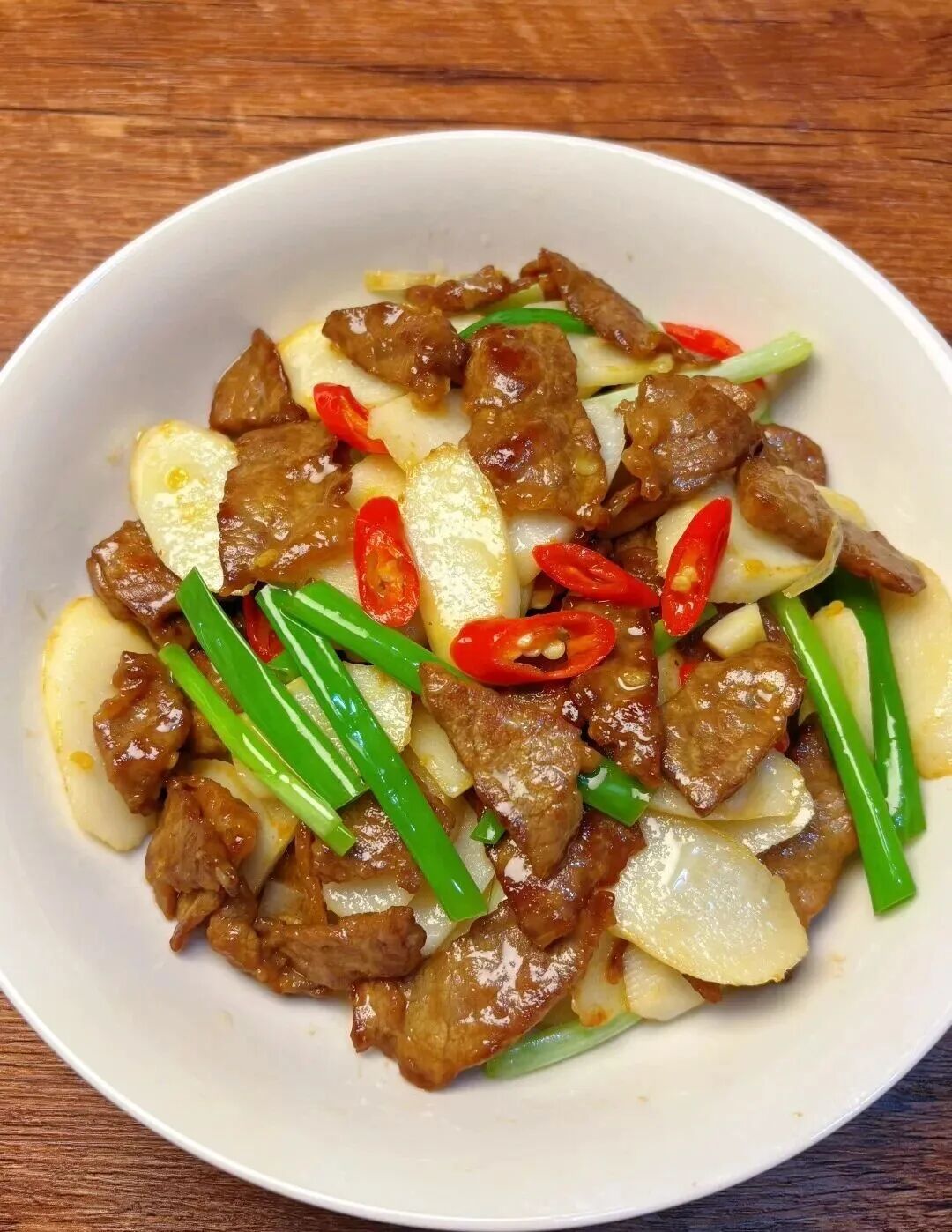 4. 倒入牛肉、葱段,快速翻匀即可。