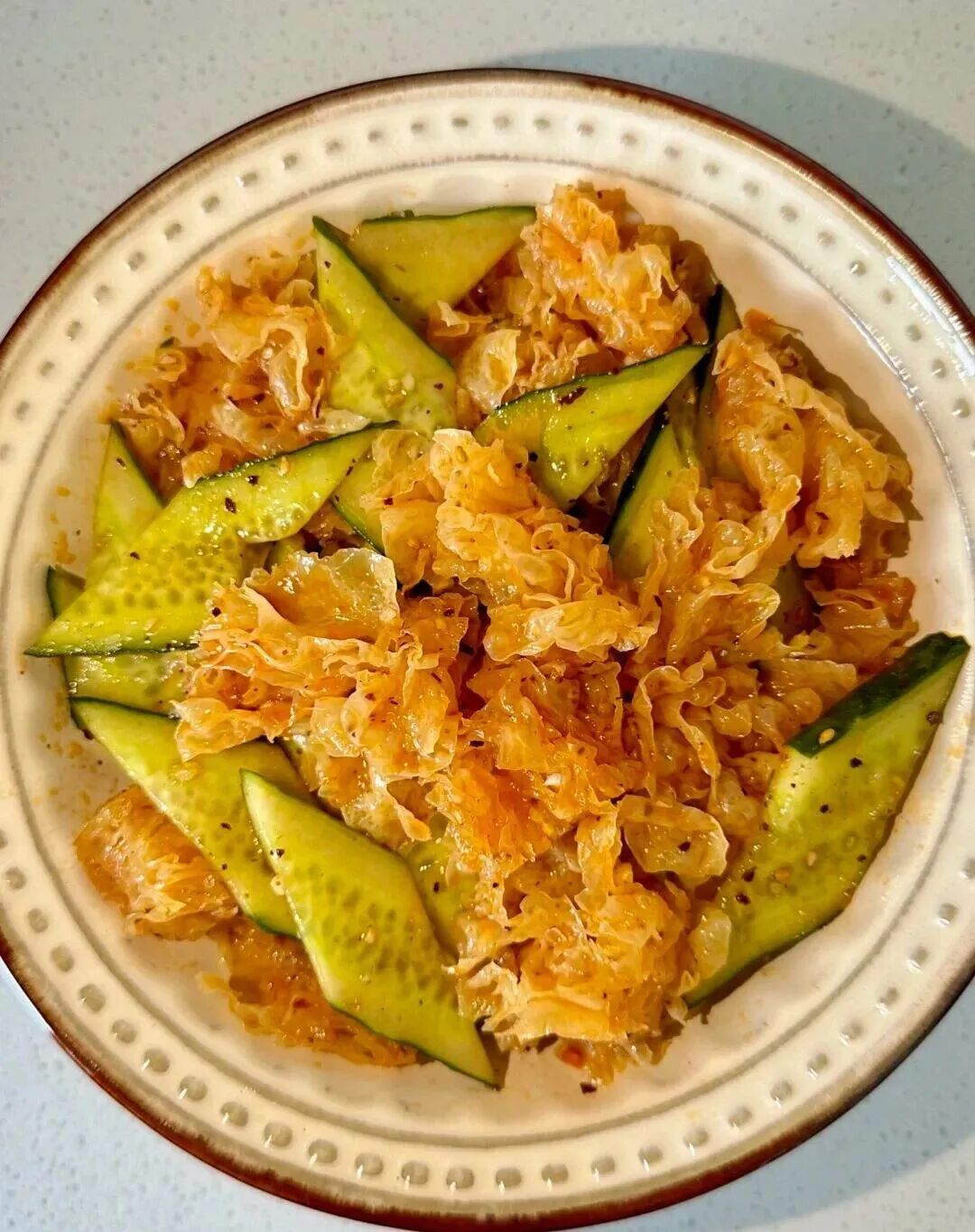 2. 混合银耳、黄瓜、蒜末、白芝麻,淋入酱汁(2勺生抽+3勺醋+半勺蚝油+1勺味精+1勺香油+少许盐+1勺辣椒油)拌匀即可。