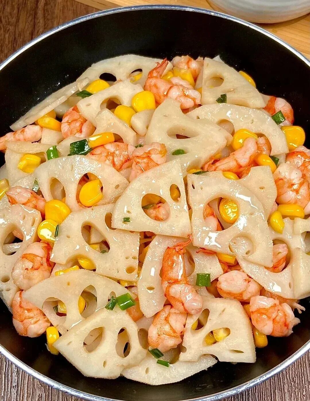 2. 热锅少油将虾仁煎熟,倒入藕丁、玉米粒翻炒。