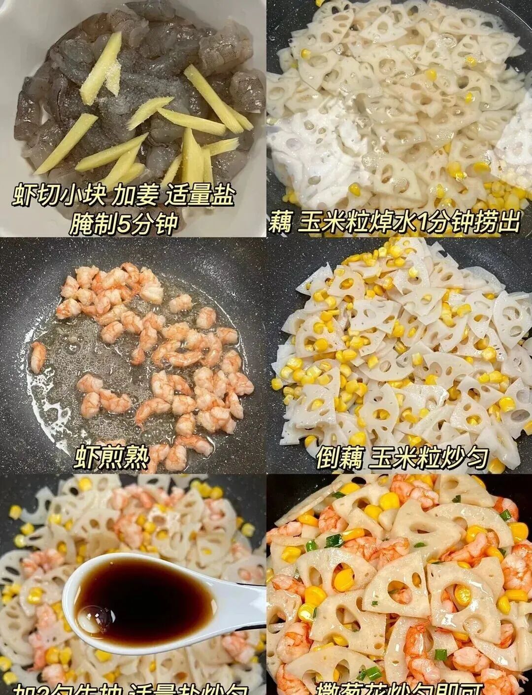 1. 莲藕去皮切丁,与玉米粒一同焯水1分钟捞出;鲜虾去壳切块,加姜片、盐腌制。