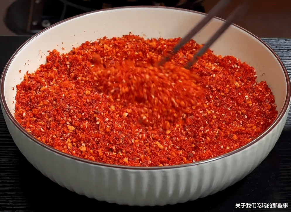 第三,给辣椒面倒热油,不要一股脑倒进去,记得分三次,这样去做一方面避免炸糊,另一面可以激发出辣椒面的香气、辣度和红亮色泽。
