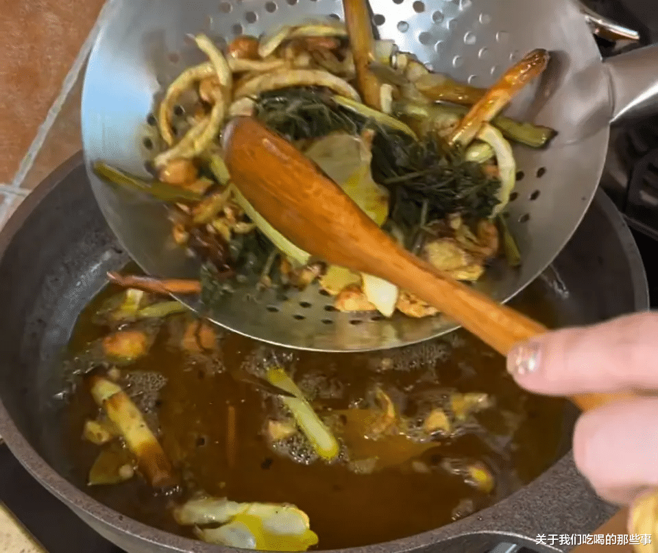 锅内加油开火,把蔬菜部分和香料部分都放进去,小火慢炸,时不时拨动几下,受热均匀,充分炸出香味。一直炸到表面金黄,用漏勺捞出,让油变得干净无渣。