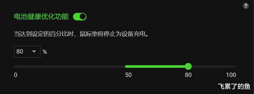 它不但能给鼠标无线充电,还具备电池健康优化功能,这就很全面了!我们可以通过雷云设置一个电量值,当鼠标电量低于这个值时,鼠标垫才会开始给鼠标充电,达到设定值后停止充电,有效避免了充满后过充影响电池寿命的情况。