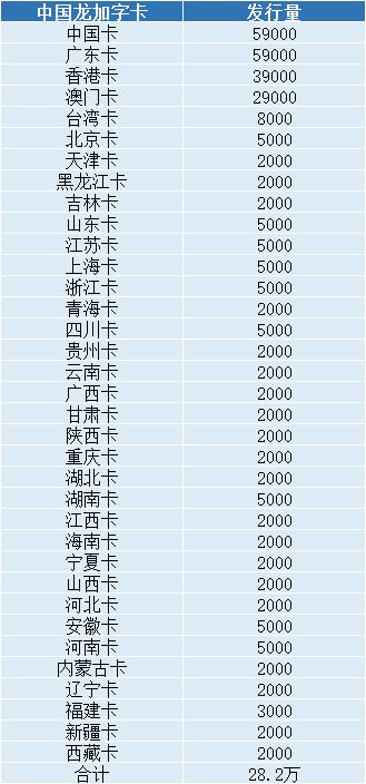 目前,各地发行额度已经公布,广东、香港和澳门3个全运会的举办地,以及中国卡发行量相对较大,其余省份为几千套。