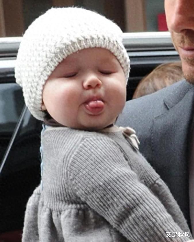 贝小七出生不久后她的照片就被刷爆了全球,她皱着眉头吐舌头的样子被做成了表情包,直接萌化了全世界,贝克汉姆对她更是爱不离手。