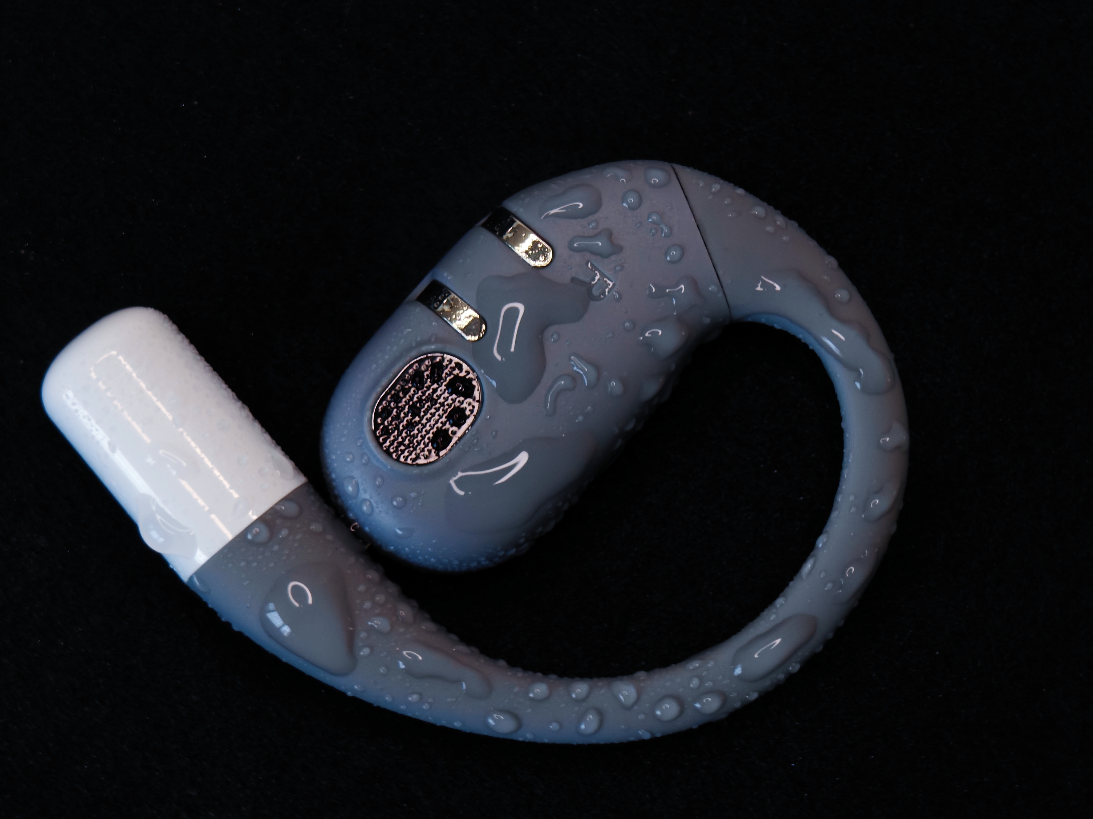 二、 细节之处见匠心:耳机本体的精妙设计1. 外观与材质耳机采用耳夹式设计,单耳重量仅8g,佩戴起来几乎无感。流线型的工学设计,完美贴合耳朵轮廓,即使长时间佩戴也不会感到不适。接触耳朵的部分采用液态硅胶材质,柔软亲肤,防滑防汗,确保佩戴的稳固性和舒适性。