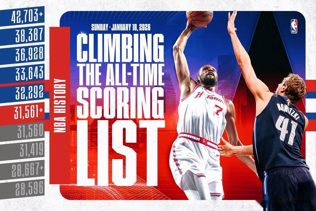 1月19号火箭主场打鹈鹕,末节15.2秒。杜兰特强突造犯规,获得罚球机会,见证历史的一刻。第一罚穿网,记分牌跳成31561。这一得分把诺天王甩在了身后,个人得分来到了历史第六的位置。最后,火箭119:110战胜。