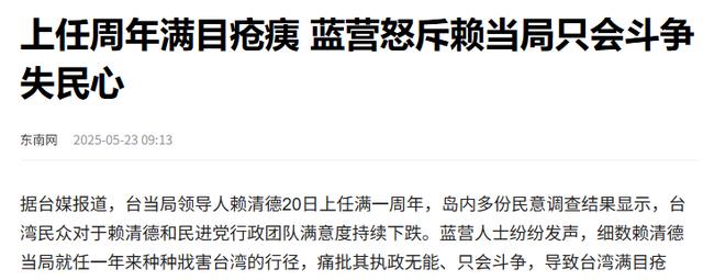 东南网2025-05-23 ——上任周年满目疮痍 蓝营怒斥赖当局只会斗争失民心