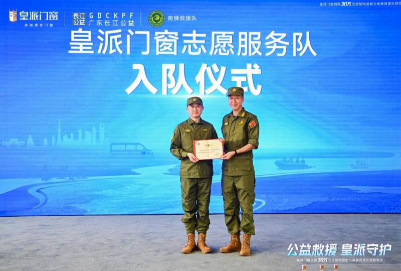 而“皇派志愿服务队”的成立,标志着皇派门窗公益之行从物资支持迈向深度参与。现场,“皇派志愿服务队”宣告正式加入南狮救援体系,南狮救援队队长马建华为皇派志愿服务队队长朱福庆颁发了聘书与队旗。随后,全体皇派志愿服务队队员庄严接受象征责任与使命的救援衔领章,将以全新身份投入公益救援,将“守护”的边界从千家万户延伸至更广阔的社会安全领域。