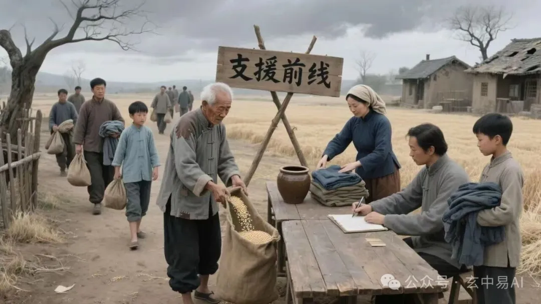 战争的苦难,不仅在前线蔓延,更在后方百姓的生活中刻下深深的烙印。为支援前线,百姓们遵循着道家“知足常足,知止不殆”的智慧,省吃俭用,将家中仅有的粮食、衣物悉数捐出。城郊的李家大娘,丈夫与儿子都上了战场,她便带着儿媳和孙儿日夜赶制军衣、军鞋,双手磨出厚厚的老茧,渗出血泡,却从不停歇。有人问她累不累,她只是笑着说:“前线的娃们在拼命,咱这点苦算啥?守住了和平,日子才能回到'甘其食,美其服的模样。”村里的孩童们也没闲着,他们跟着大人学习传递情报、照顾伤员,小小的身躯背着药箱穿梭在山林间,他们不懂太多大道理,却记得先生说过“含德之厚,比于赤子”--赤子之心,便是守护家园的初心。田野里,原本该是“春种秋收”的景象,却因战争变得荒芜,杂草丛生,百姓们在饥饿与恐惧中艰难度日,却始终坚信“飘风不终朝,骤雨不终日”,黑暗终将过去,和平定会到来。