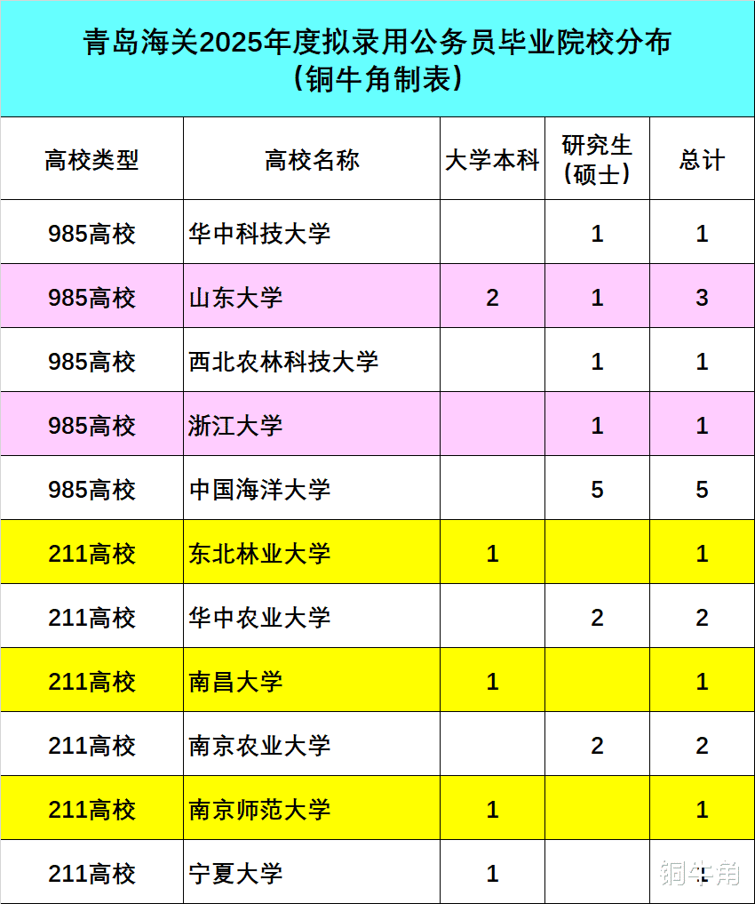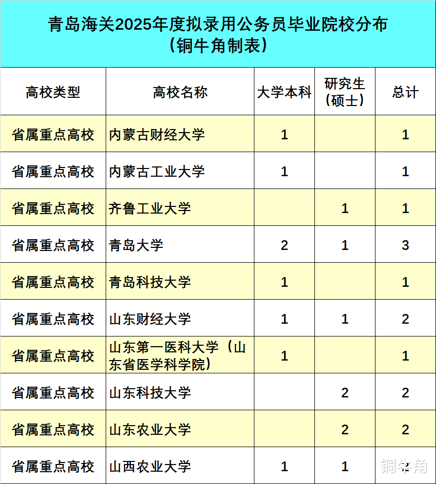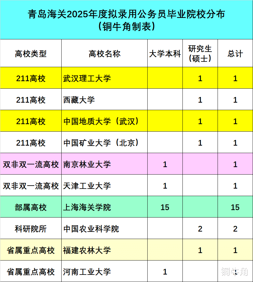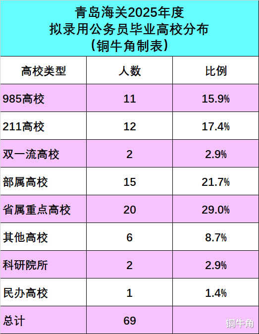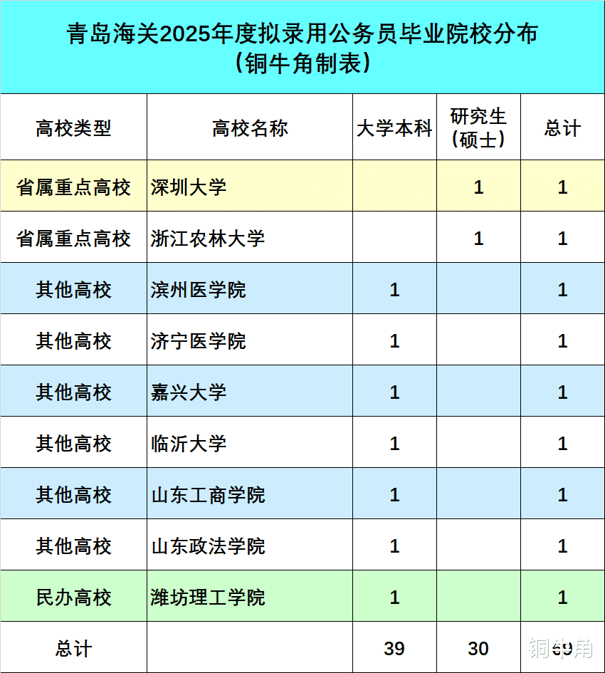 青岛海关2025年拟录用69名公务员,其中有本科毕业生39名,占比56.5%;硕士毕业生30名,占比43.5%。