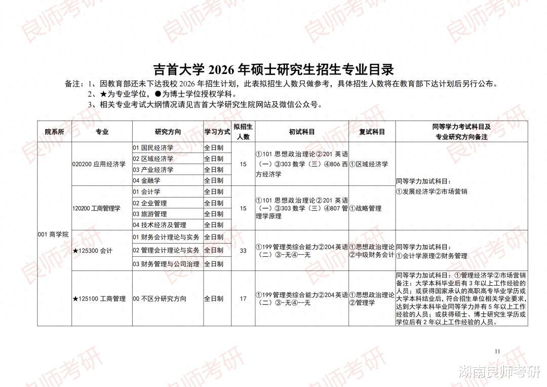 学校2026年硕士研究生招生规模950人左右(含“大学生退役士兵”专项招生计划约7人),具体招生学科、专业、研究方向和招生名额详见《吉首大学2026年硕士研究生招生专业目录》,最终录取名额以教育部下达的招生计划为准。根据国家下达的实际招生计划、推免生实际录取情况和生源状况,学校保留对各专业招生人数进行调整的权利。