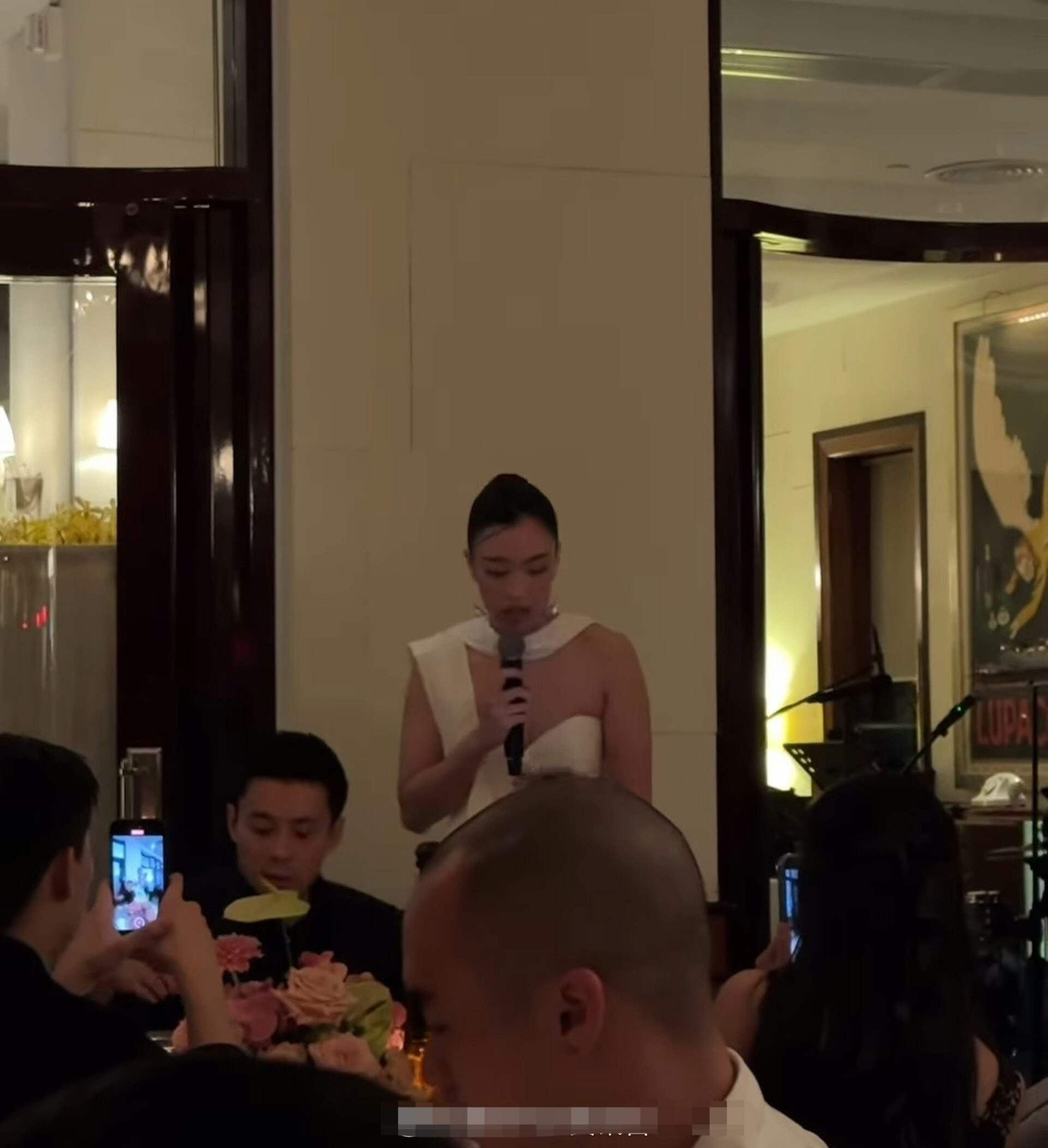 背景里,疑似霍启仁正和朋友围坐一桌聊得火热,另一张照片里 Namfon 拿着话筒致词时一脸严肃,霍启仁就坐在旁边当 “护花使者”。