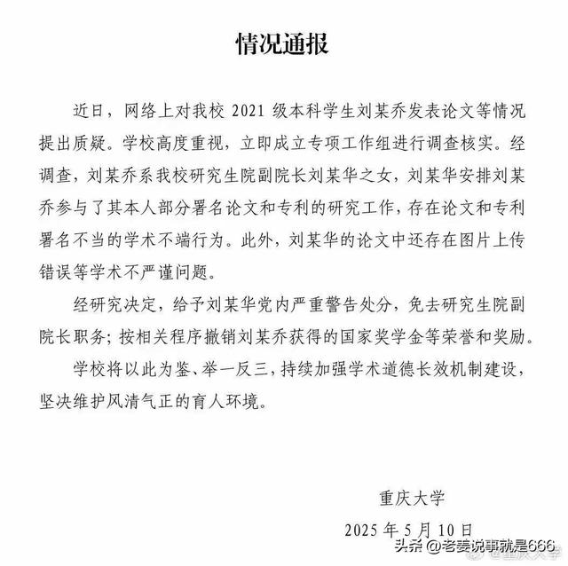 刘某乔系该校研究生院副院长刘某华之女,刘某华安排女儿参与自己部分署名论文和专利的研究工作,存在论文和专利署名不当的学术不端行为。此外,刘某华的论文还存在图片上传错误等学术不严谨问题。最终,刘某华被给予党内严重警告处分,免去研究生院副院长职务;刘某乔获得的国家奖学金等荣誉和奖励也按程序被撤销。