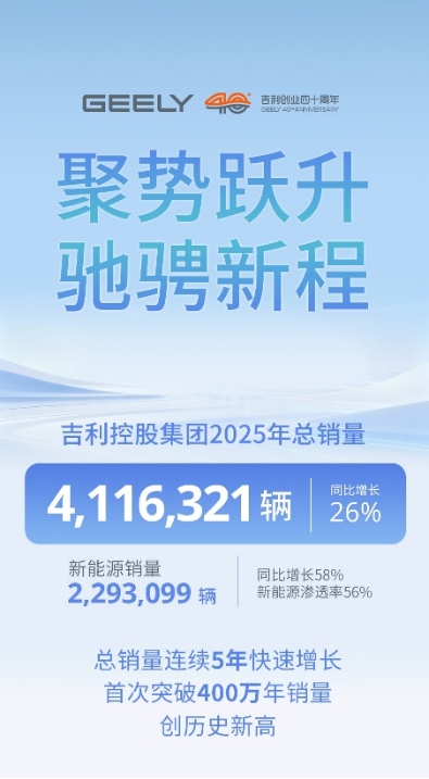 2025年,吉利控股集团全球总销量4,116,321辆,同比增长26%,实现连续五年快速增长,年销首次突破400万大关,创历史新高;其中新能源销量2,293,099辆,同比增长58%,新能源渗透率56%,成为集团市场增长的主要驱动力,在全球车企中处于领先地位。