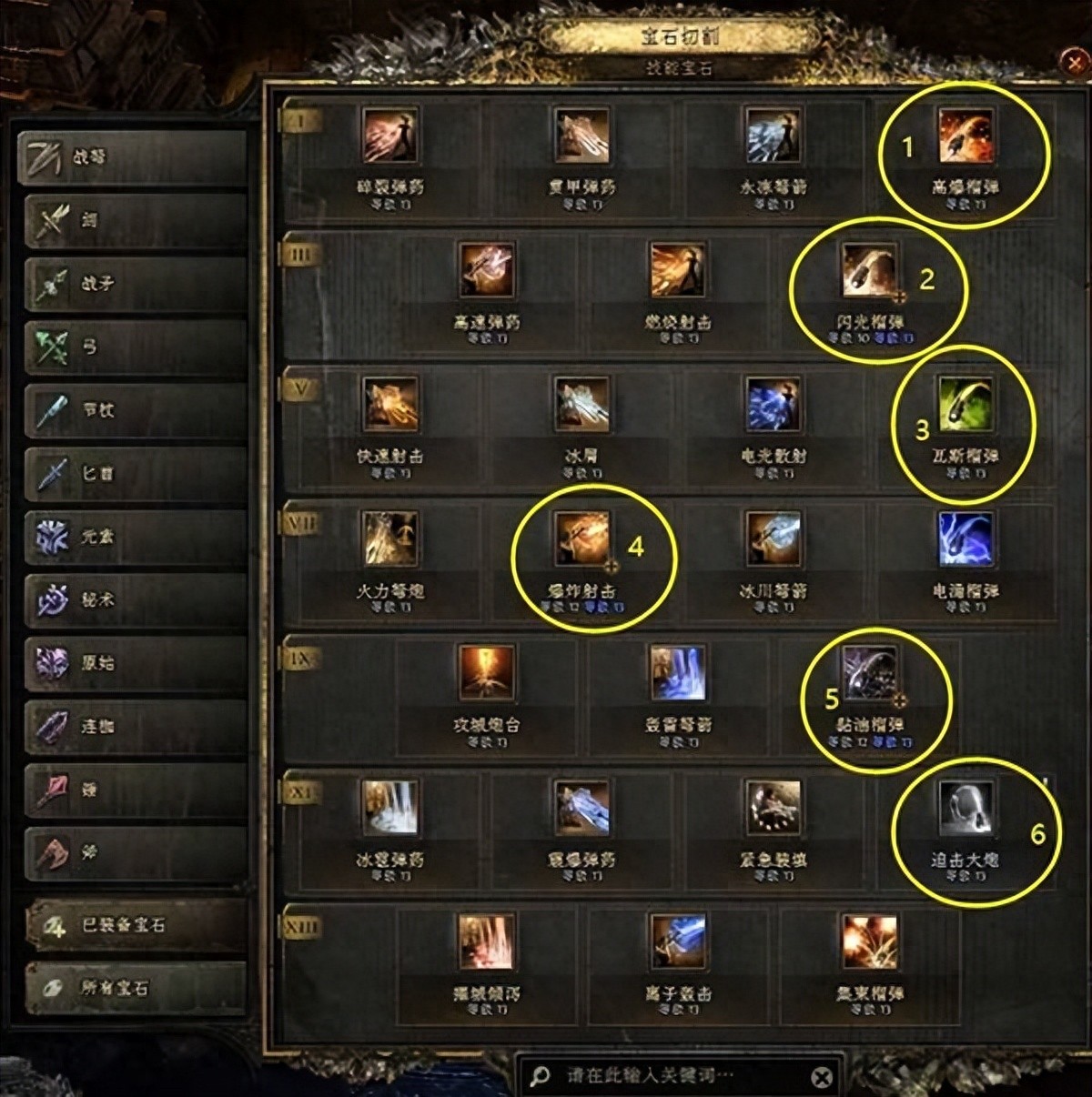 技能链接:十字弩射击+多重射击Ⅰ+闪电协调(优先2-添加辅助);十字弩武器自带,拥有7发,前期对单体好用;破裂弹药:污流河畔的大箱子赠送,主动选择更换弹药类型,适合群攻,只有1发,不喜欢可以不用,会卡手;高爆榴弹+多重射击Ⅰ+火焰协调(优先1-升级和添加辅助)进入营地后NPC蓝礼会给一个未切割宝石(Ⅰ),解锁高爆榴弹;闪光榴弹+多重射击Ⅰ+定身Ⅰ(有多余的可以上,不强求)3级主动技能石解锁,需要任务6级,主要用于打BOSS定身或者被围攻时脱 身用,引爆比较快;退避三舍:如果获取了战矛,有多的主动技能石,可以解锁一个,用于后跳躲避包围;灰烬之捷:茂棘深林的任务完成后解锁第一个30精魂物品,可以开启第一个精魂宝石,记得插入宝石槽后右键开启