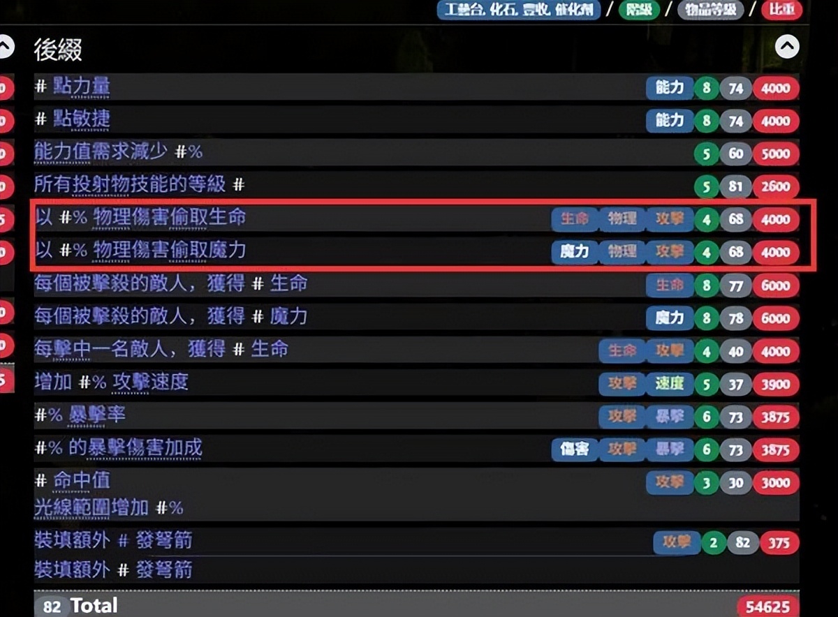 3.购买一个左旋死灵预兆和遗存颚骨,并使用,期望解密到百分比物理或者图腾数量+1。提示:可以加一个深渊回响预兆,多一次解密的机会4.此时你的武器已经有3前缀,1个后缀,我们需要将后缀填满,可以购买高级崇高石和强效崇高预兆(或者同质化崇高预兆)提示:由于我们前缀有物理词条,同质化崇高预兆可以让我们后缀出现携带物理标签的词条,配合高级崇高和强效崇高预兆,一次性增加2条词缀,只可能是如下图所示(这样的好处时屏蔽了较多完全没用的词),如果你本身就已经有其中的一个词存在了,则不需要这么复杂