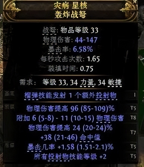 武器参考:33级后,更换武器,轰炸战弩的底子有+1额外榴弹,还是优先高伤害即可。物理、元素,后缀投射物等级均可,多关注商店和拾取,这把武器足已通关前四章节。