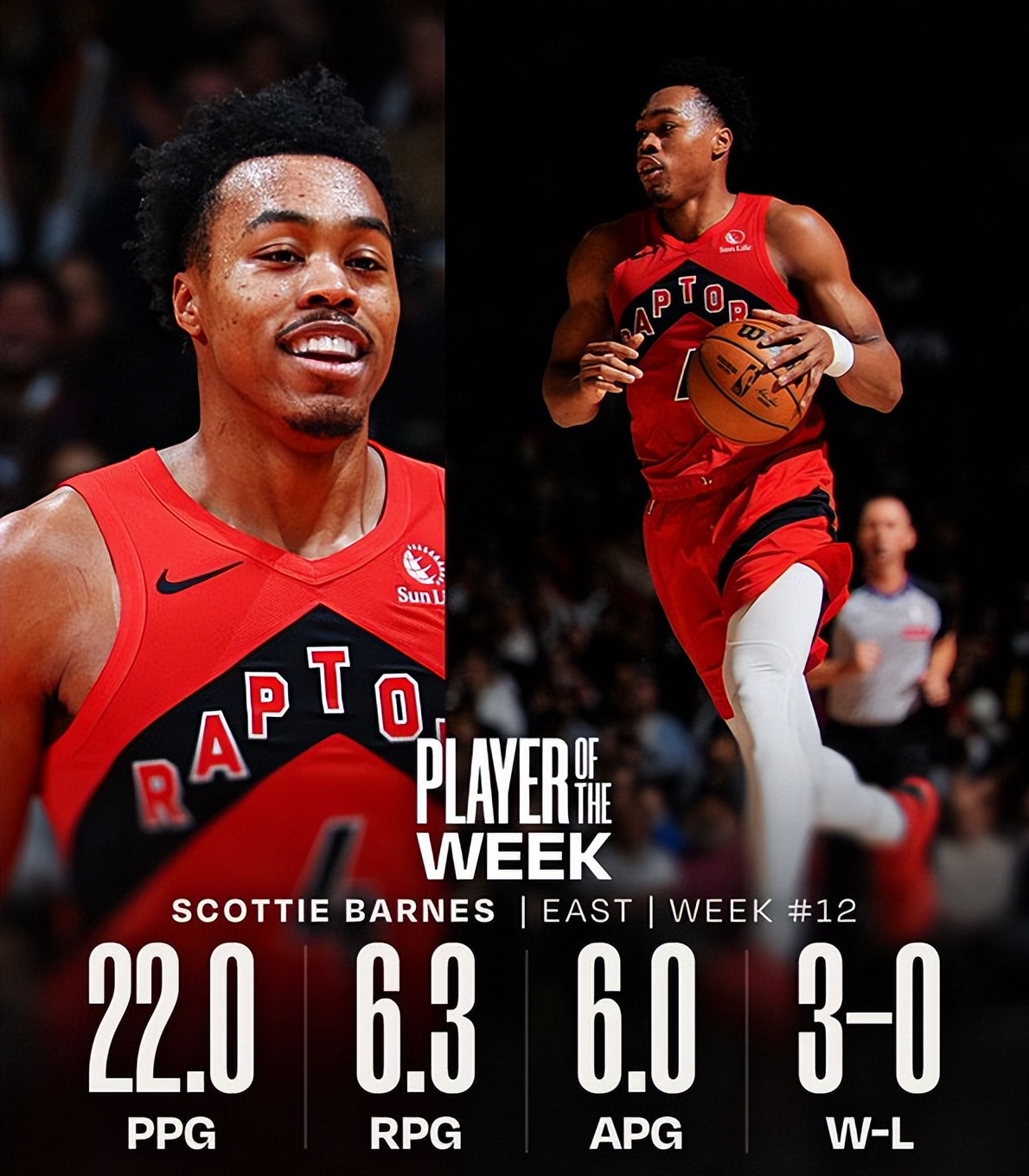 在猛龙加时险胜费城76人的比赛中,英格拉姆与巴雷特这两位核心球员双双因伤缺阵,但巴恩斯贡献31分6篮板7助攻,并在加时赛完成罚球绝杀,这也是他能获得周最佳的重要原因。