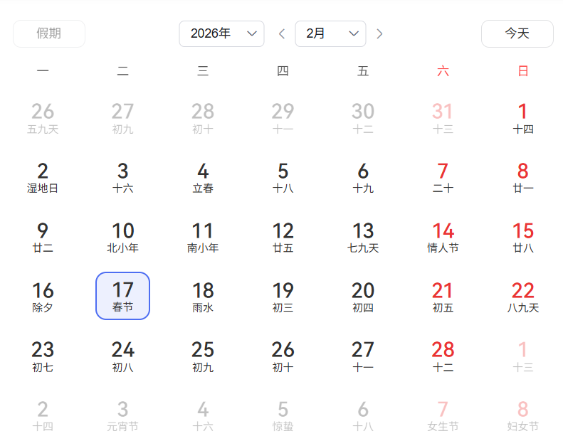新易学小编查看日历后,发现2026年春节时间为2月17日。