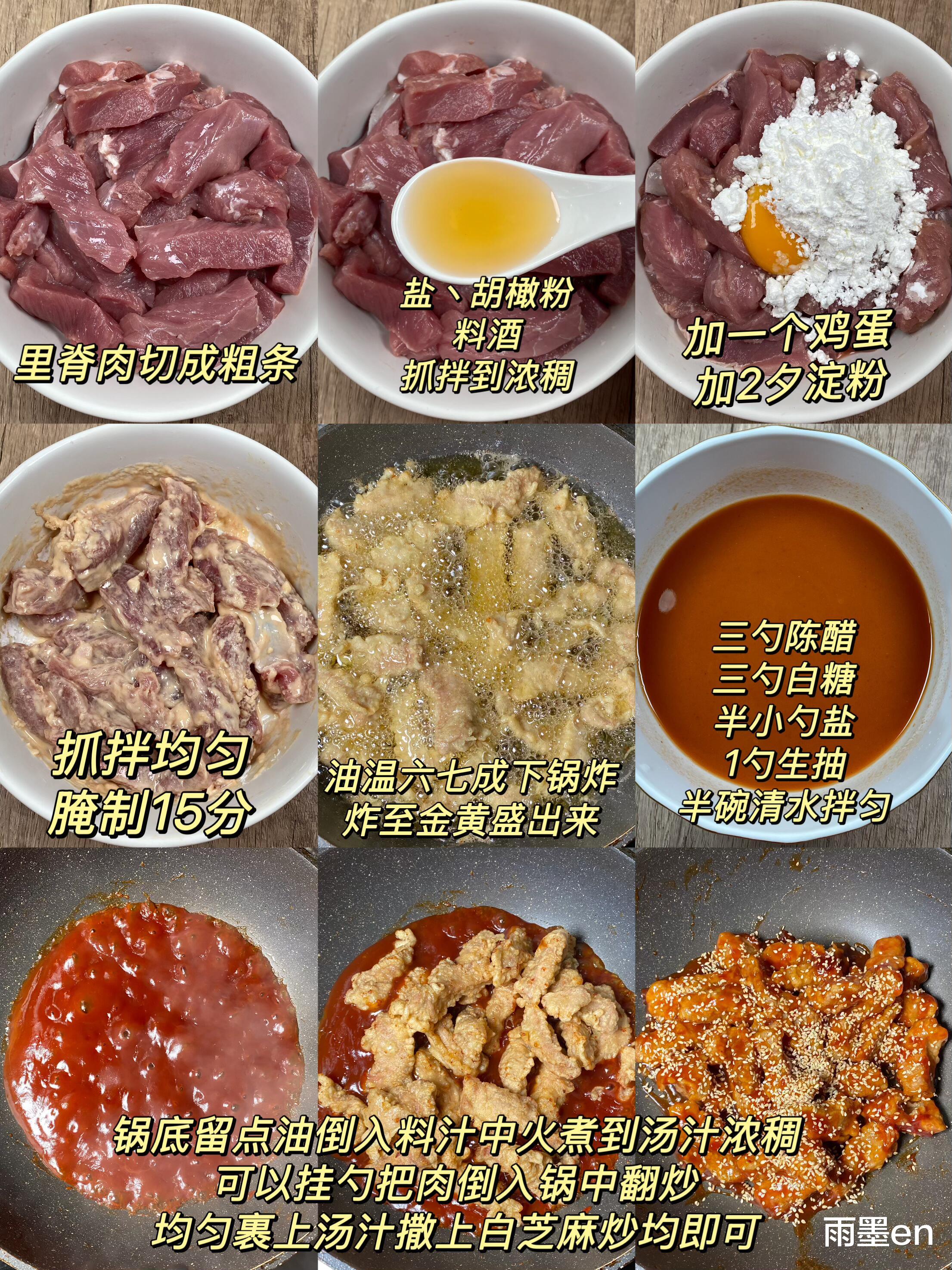 做这道菜的食材超简单:300克猪里脊肉、2个鸡蛋、50克玉米淀粉、30克面粉、3勺白糖、2勺香醋、2勺生抽、1勺料酒、少许盐和葱花。先处理里脊肉:切成0.8厘米厚的长条,放入碗中,加1勺料酒、半勺盐、1个蛋清,抓匀腌制15分钟,这样既能去腥,又能让肉质更嫩滑。