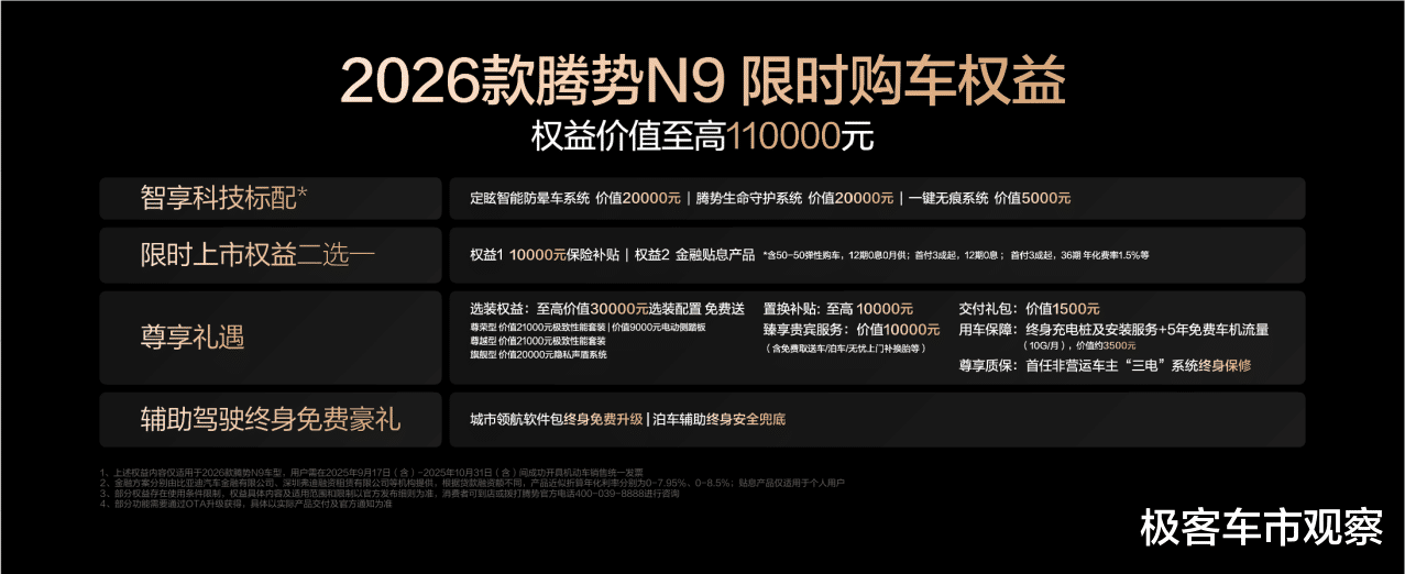 为回馈广大用户的支持与信赖,2026款腾势N9特别推出限时购车权益:10月31日(含)前提车的用户,全系可享10000元保险补贴或金融贴息(二选一),置换补贴至高10000元。此外,还有价值45000元的智享科技,以及辅助驾驶终身免费豪礼。根据不同款型,限时赠送极致性能套装、电动侧踏板、隐私声盾等科技豪华配置。智能电动门、吸顶屏套装、流媒体外后视镜以及双色车身均享限时选装价格,让豪华触手可及。详情敬请咨询腾势直营店及当地经销商。