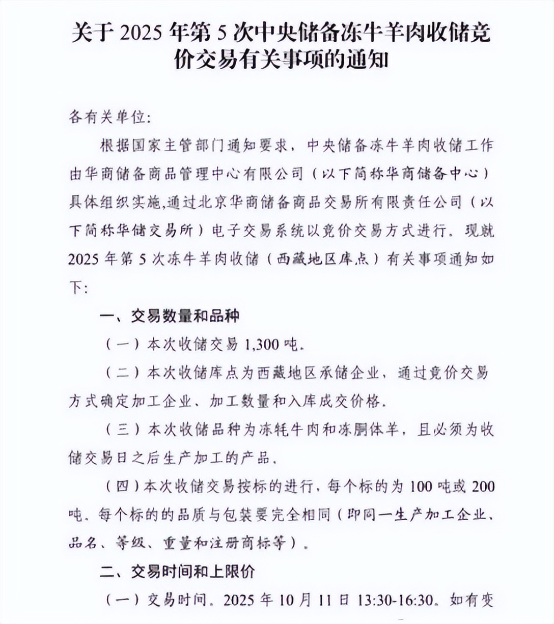 近日,华储网发布《关于2025年第5次中央储备冻牛羊肉收储竞价交易有关事项的通知》。