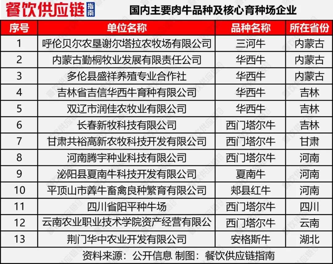 (2)种牛繁育根据农业农村部今年3月公布的2024国家畜禽核心育种场增补名单,现有国家肉牛核心育种场地共13家,含今年新增的5家。也有部分企业自研繁育,如内蒙古中农兴安种牛科技有限公司纯种牛繁育分公司。