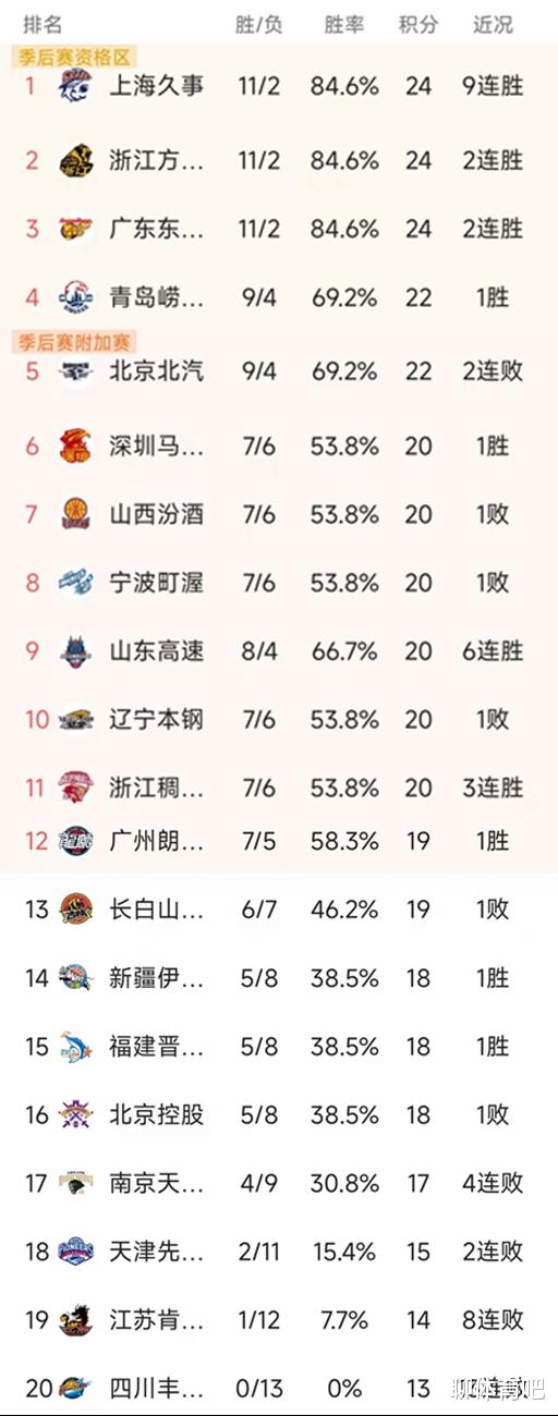 山东目前的战绩是8胜4负,他们只打了12场比赛,昨晚89-76战胜南京迎来一波6连胜,仅次于9连胜的上海。广州以7胜5负积19分暂列第12名,吉林6胜7负积19分暂列第13名。新疆、福建和北控都是5胜8负积18分暂列第14-第16名。南京遭遇4连败,4胜9负积17分,天津、江苏和四川排在后三名,其中四川遭遇13连败垫底!
