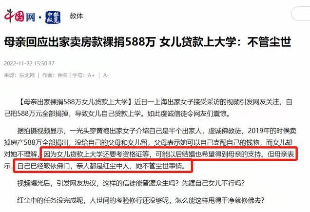 参考资料:齐鲁晚报——女子称自己卖房裸捐588万出门修行,女儿无奈借学贷上学