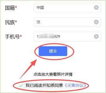 所有信息均为必填项,确认无误后在底部勾选确认“采集协议”并点击“提交”按钮即可。