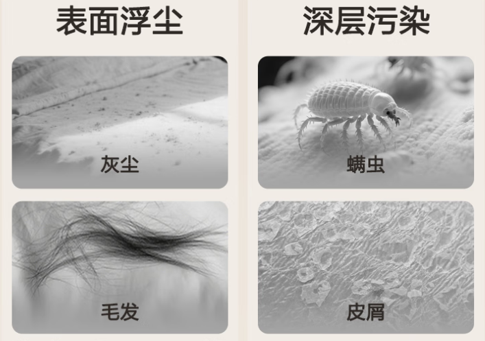 螨虫本身虽小,但会附着在织物纤维深处,还会携带灰尘、皮屑形成 “螨虫团”。普通吸尘器 10-12kPa 的吸力很难将深层螨虫吸出,而家用除螨仪建议选15kPa 以上的机型 —— 实测中,13kPa以上的吸力能轻松吸走床垫、沙发深处的螨虫及排泄物,即使是厚被褥也能穿透;若家里有宠物或成员易过敏,可优先选15kPa 以上的强效款,清洁更彻底。