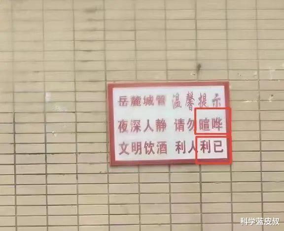 标语写道:“夜深人静,请勿暄哗。文明饮酒,利人利已。”显然,标语里的“暄”和“已”,都是错别字。