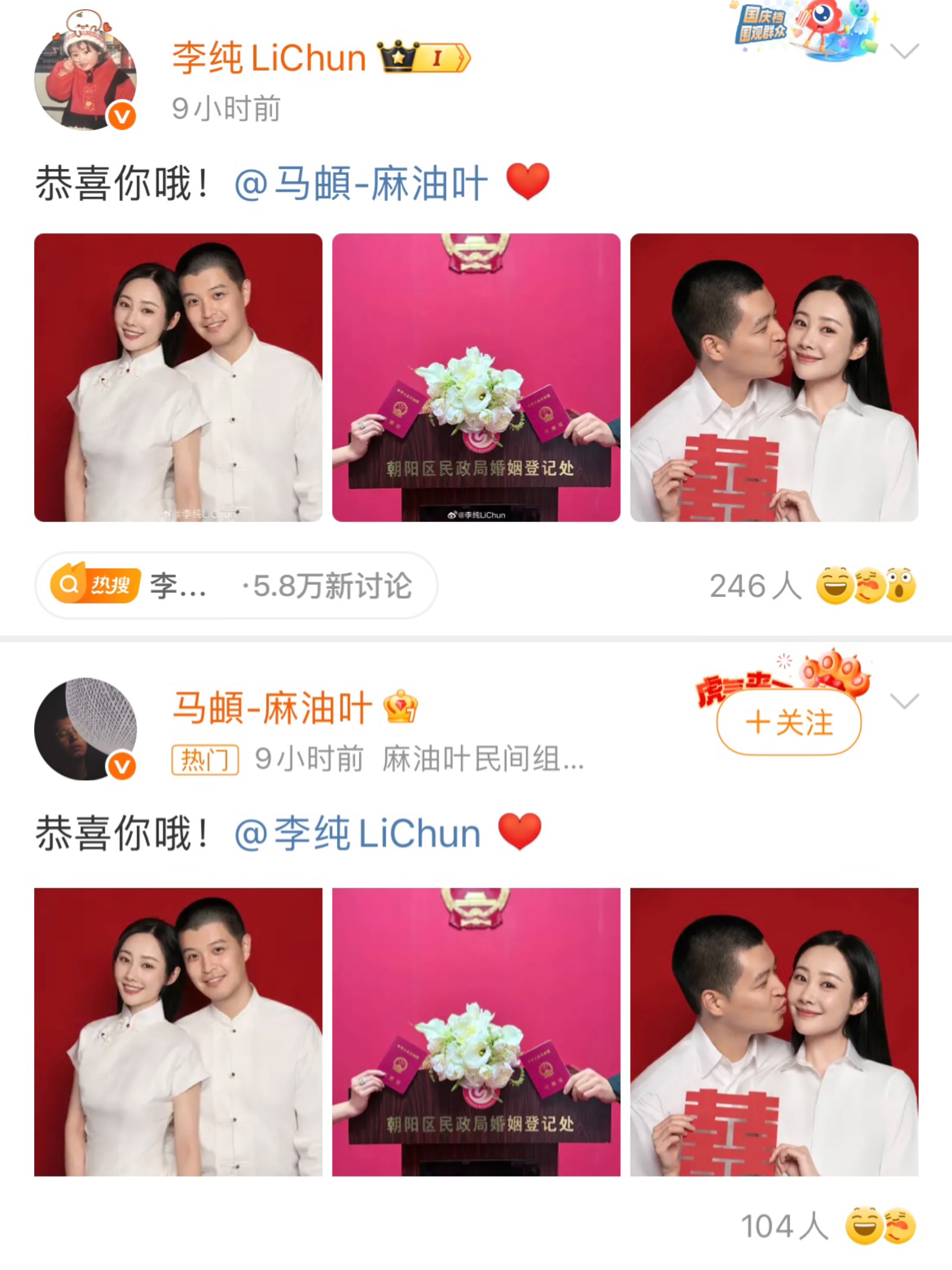 国庆假期第二天,演员李纯与歌手马頔同时晒出结婚证配文“恭喜你哦”,三张甜蜜合照中,红底白衬衫的登记照、改良旗袍的温婉侧影、民政局前捧结婚证的灿烂笑容,瞬间点燃全网祝福潮。这场持续三年的爱情长跑,终于在国庆的喜庆氛围中画下完美句点。