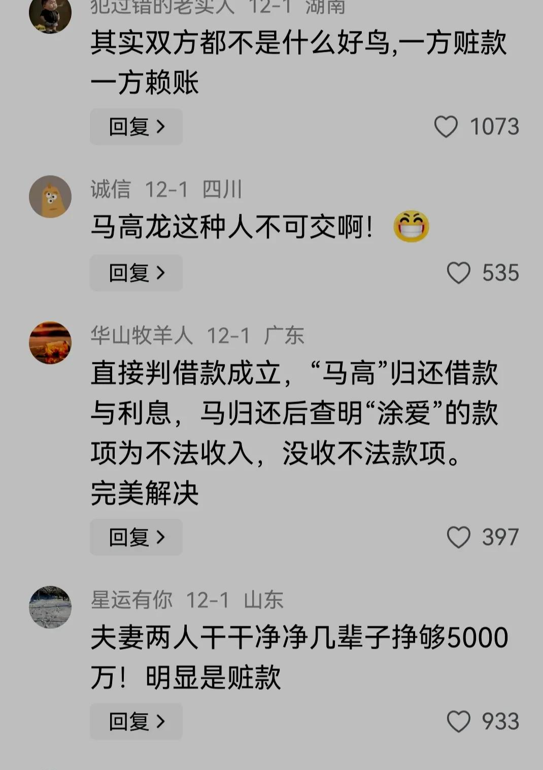 在该起民事案件中,这笔钱是否该偿还成了争议焦点。马高龙认为,涂爱芳的6800万元资金系赃款,不该偿还。而且,中国裁判文书网显示,涂爱芳现有的民事争议主张超过两亿元;涂爱芳则认为,案涉资金已由相关部门确认为合法资产。再则,资金来源是否合法,都不应该成为马高龙不还款的借口。