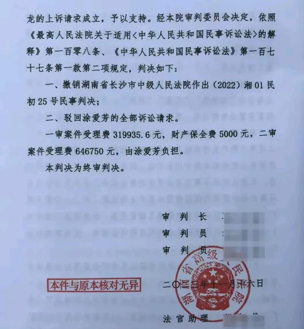 2023年11月16日,湖南省高级人民法院作出(2022)湘民终394号《民事判决书》:撤销长沙市中级人民法院作出(2022)湘01民初25号民事判决书。2024年9月,涂爱芳向最高人民法院申请再审并获立案审查。