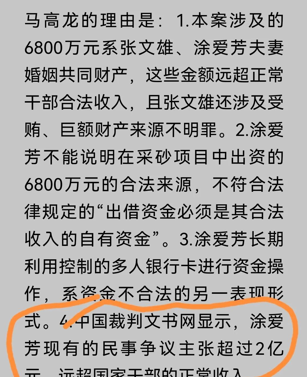 张文雄落马后,其妻涂爱芳通过法院起诉,向马高龙追讨剩余借款约5562万元。涂爱芳的理由是:2016年初,马高龙找到她家以合伙采砂为由借款1.5亿元。口头商定,涂爱芳出资6800万元,其中:1500万元作为入股10%的出资,5300万元作为给马高龙个人的借款。后来,马高龙从该项目中分得利润1.598亿,只偿还涂爱芳借款本息2200万元,截至2020年3月1日仍欠本金3389.8万,利息2172.88万。