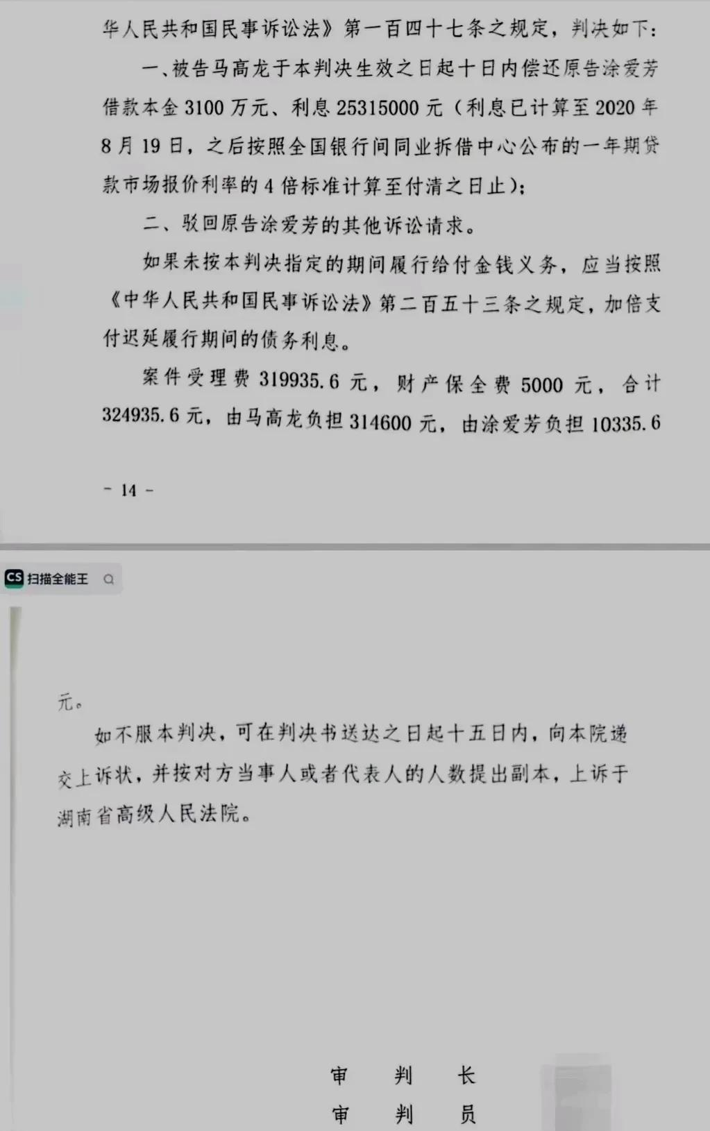 2022年8月17日,长沙市中级人民法院(2022)湘01民初25号《民事判决书》,判马高龙偿还涂爱芳借款本金3100万元、利息2531.5万元。马高龙对此判决不服,上诉至湖南省高级人民法院。