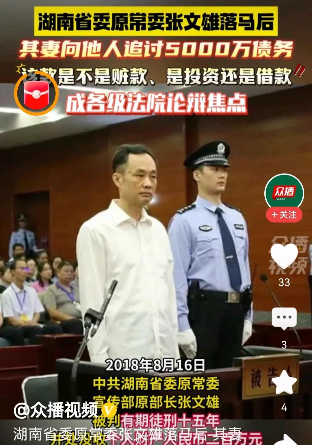 近日,原湖南省委常委张文雄落马后,其妻追讨5000多万元的借款案件,引发网友们的关注和热议。2002年至2016年上半年,张文雄利用职务便利,直接或者通过其妻涂爱芳收受财物折合人民币2335万余元。2018年8月16日,桂林市中级人民法院以受贿、巨额财产来源不明罪,对张文雄判处有期徒刑十五年,并处没收个人财产200万元。